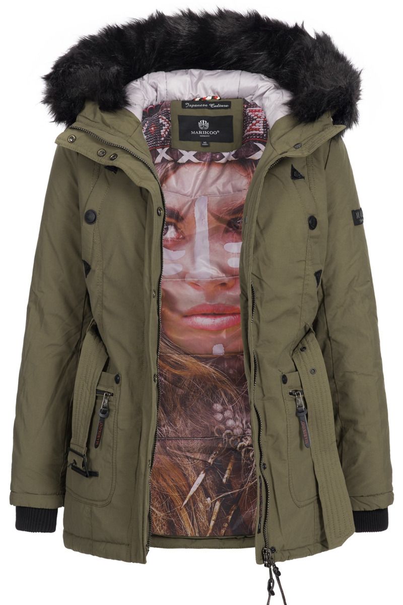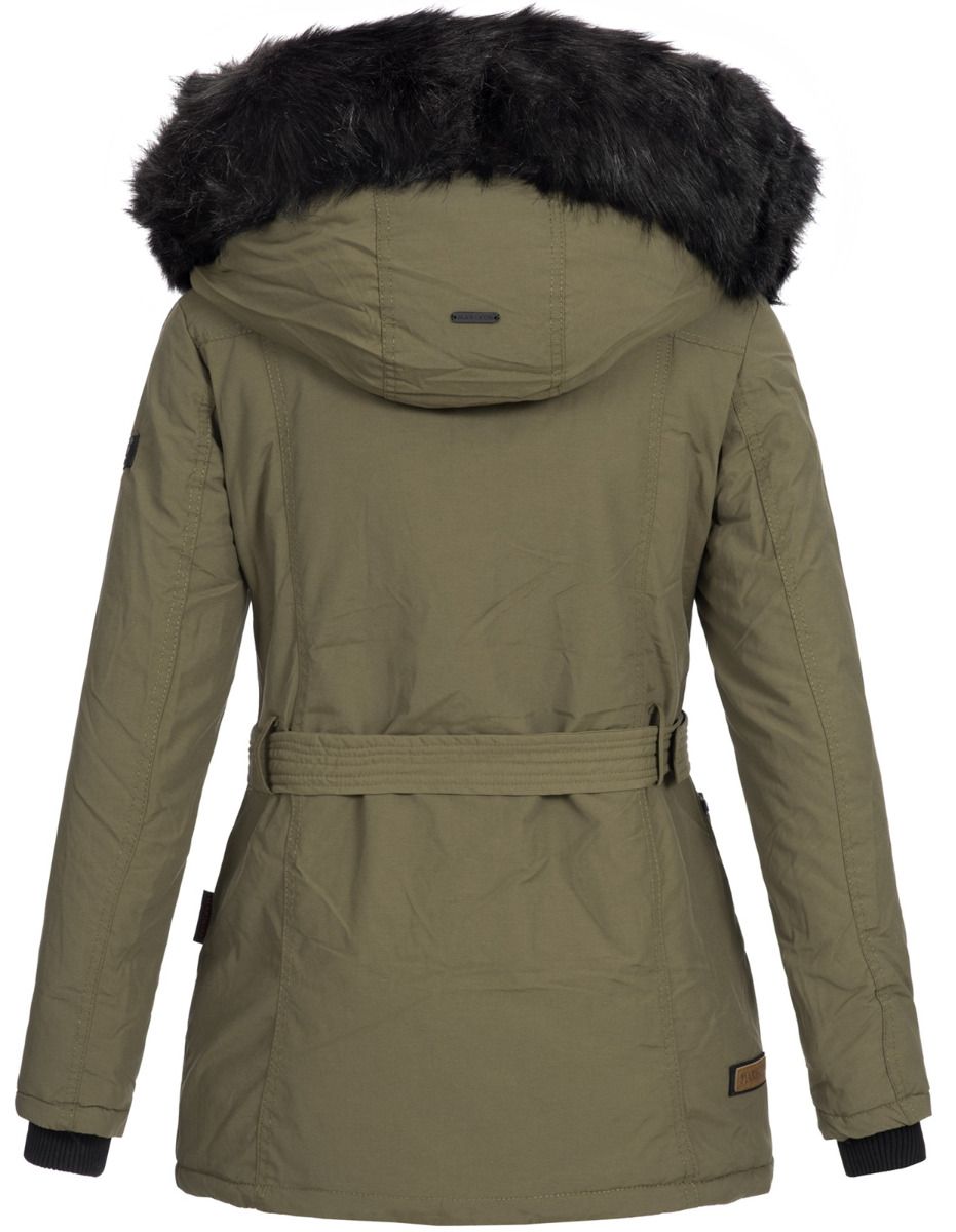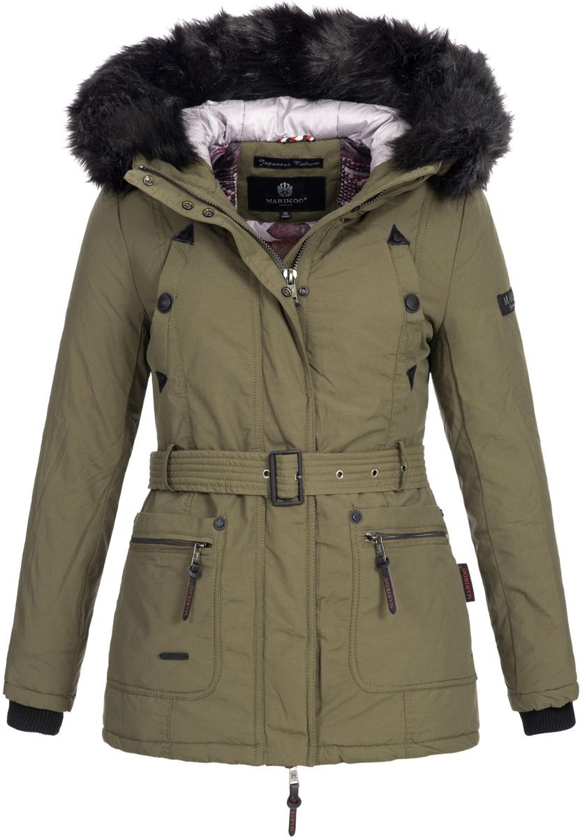 Dame vinterjakke med bælte og pels - Oliven Grøn