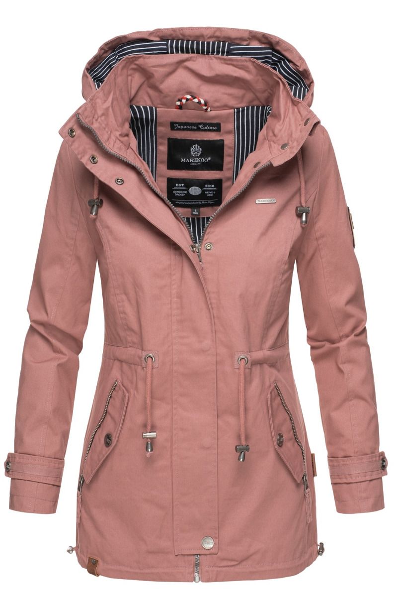 Jakken har aftagelig hætte og snøre i taljen.
