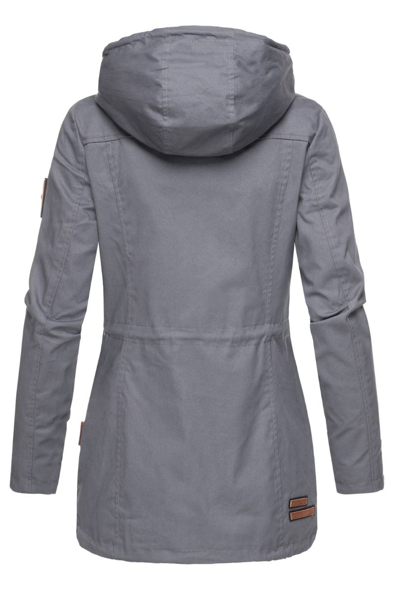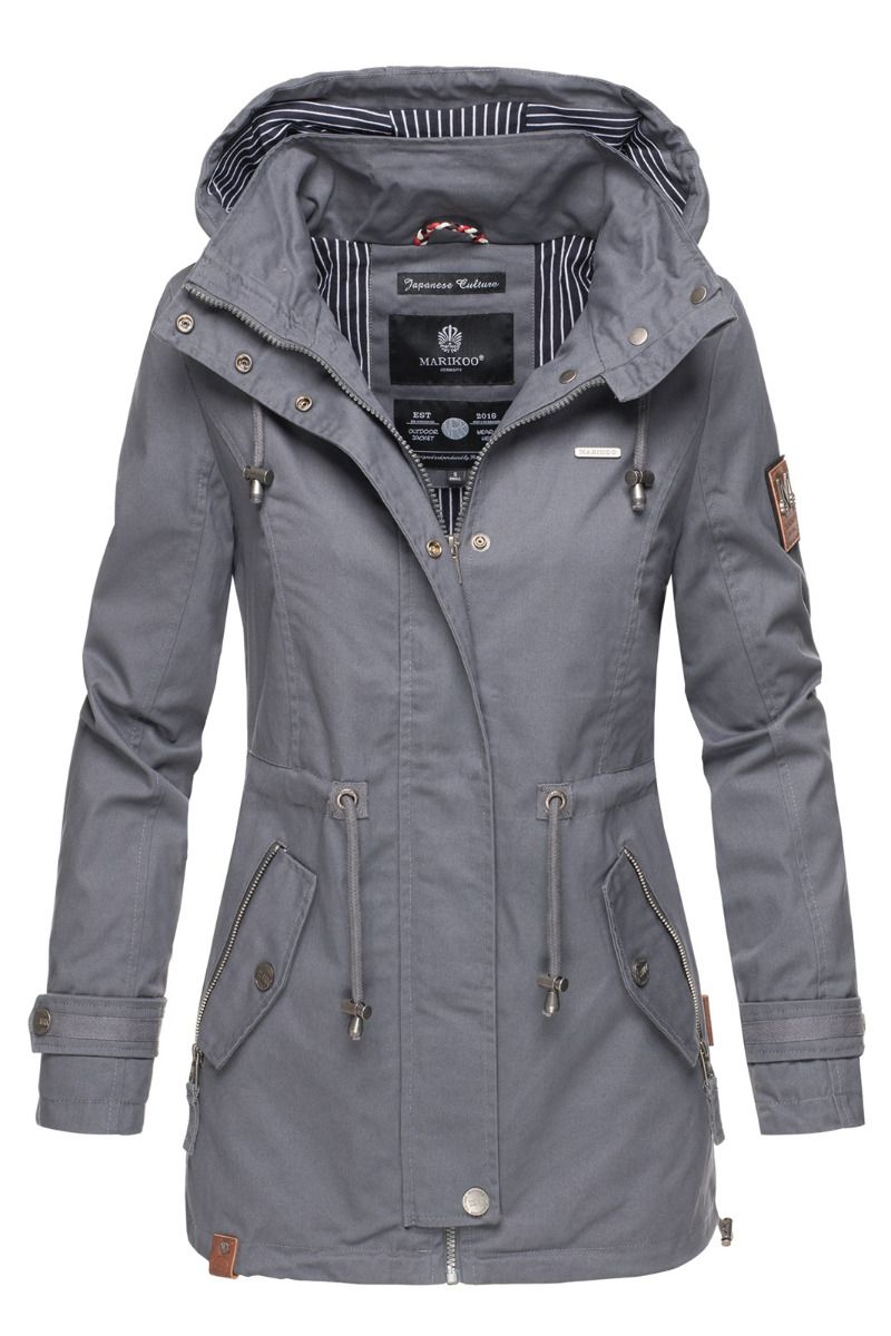 Jakken har aftagelig hætte og snøre i taljen.
