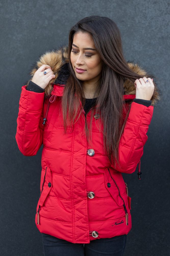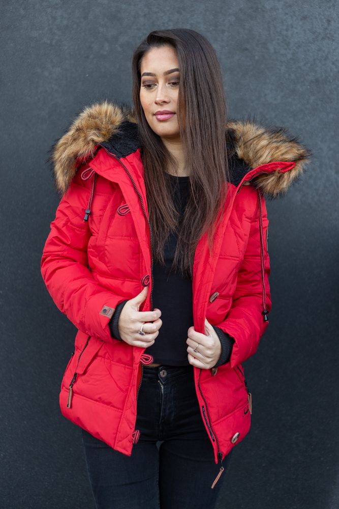 Varm vinter jakke med snøre i taljen og sort faux fur pels krave