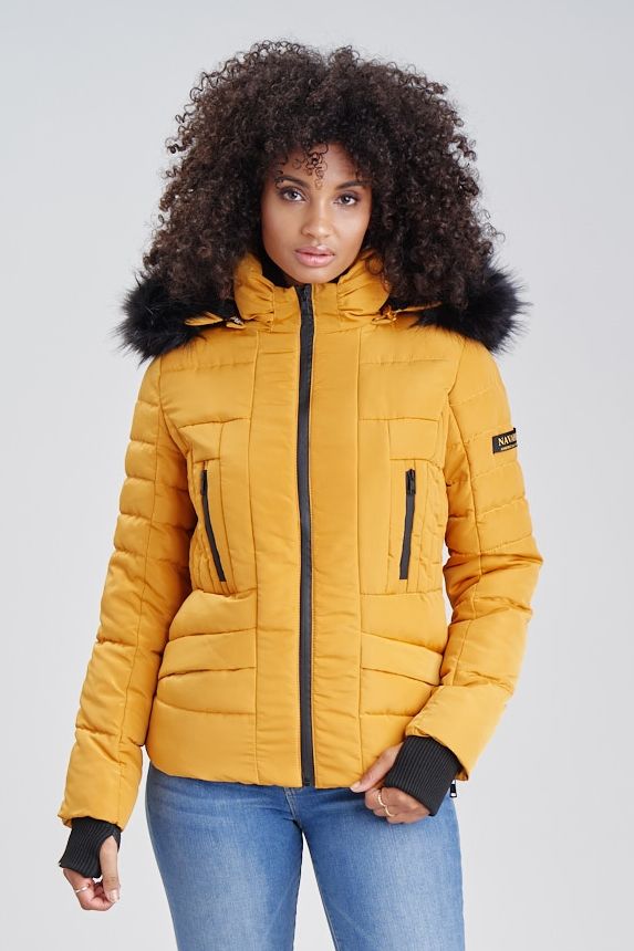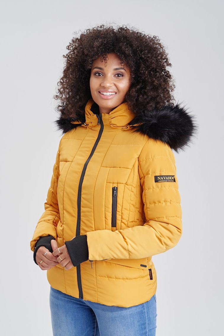 Flot kort foret Dyne vinter jakke med høj krave og sort pels kant.