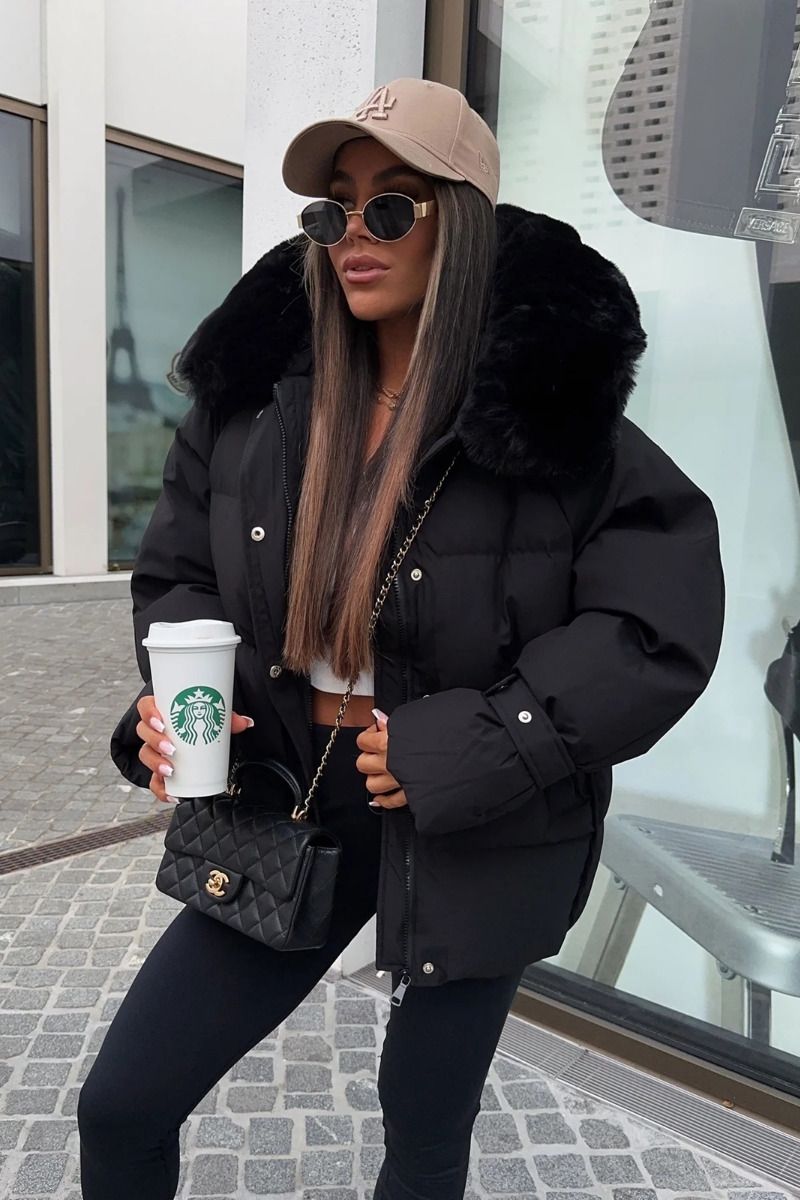 Kort dame dyne vinterjakke, med gode side lommer og hætte med aftagelig fake fur pels