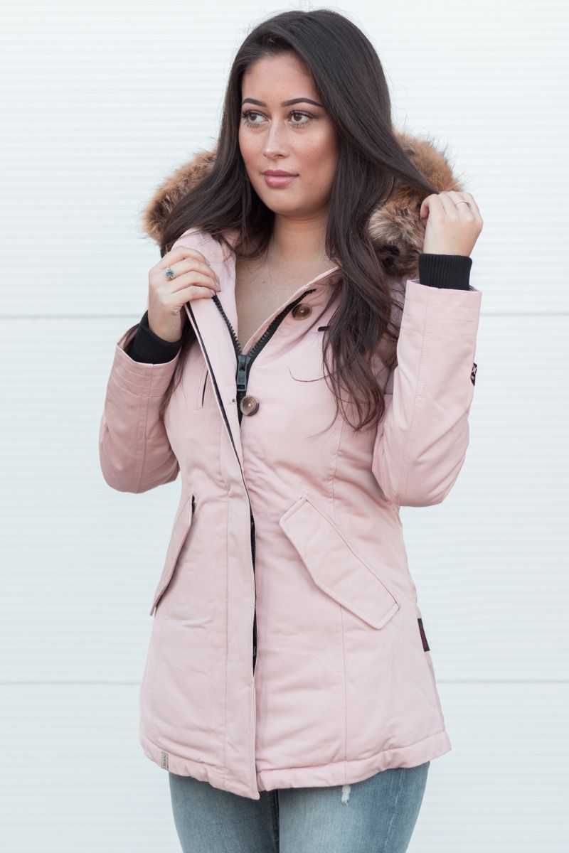 Jakken er vand afvisende og lukkes med lynlås og knapper, pelsen kan tages af.