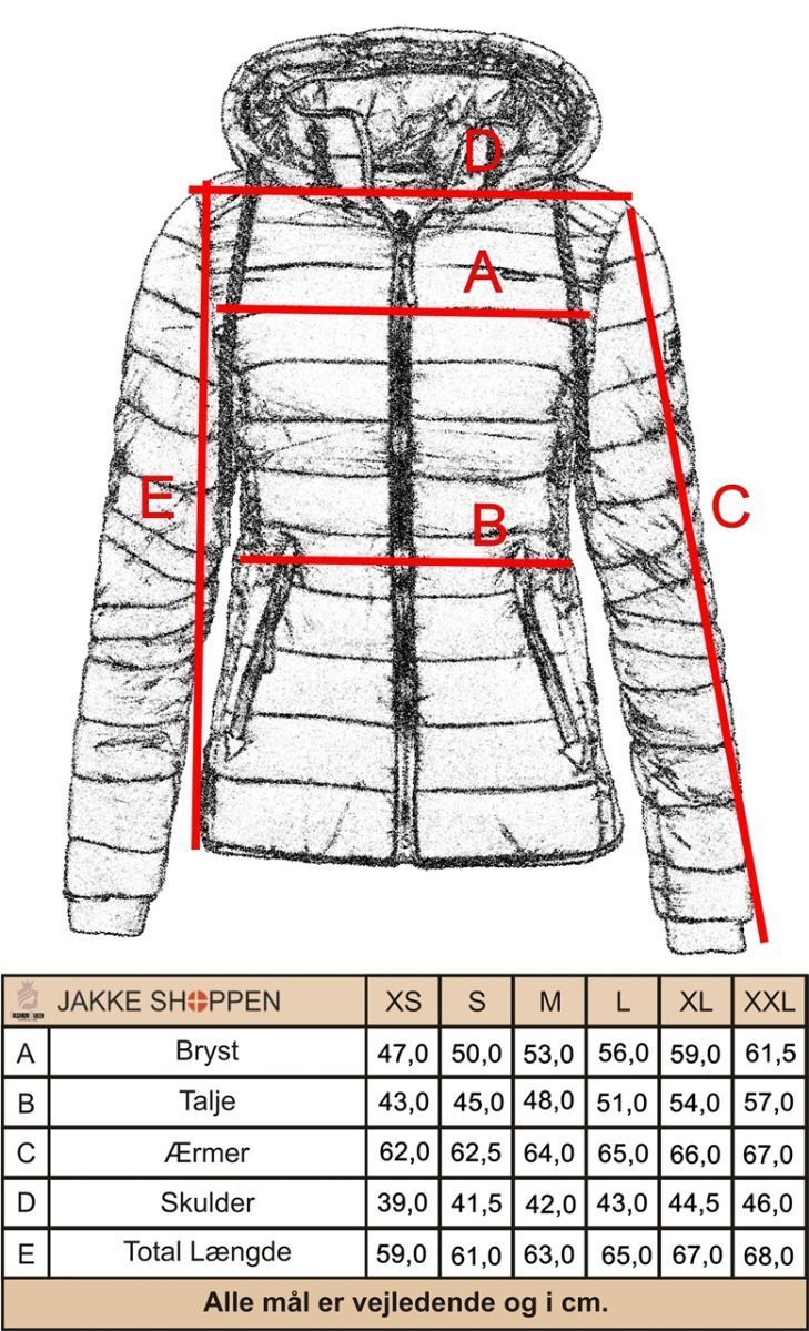 Flot let talje syet dynejakke med side lommer og hætte i lækkert design, Ideel til overgangsperioden (efterår og forår) eller milde vintre. Jakken har mange flotte detaljer.