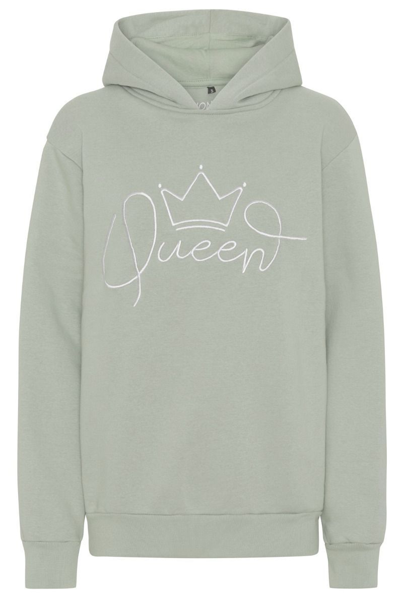 Lækker blød Lux lounge jogging sæt i pastel farver med stort broderet "QUEEN" logo på brystet / ved side lommen og en fin hætte, buksen har elastik og snøre i taljen.
